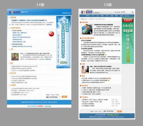 其實友商聯線15期和14期,在風格設計上是近似的,都是商務風格,簡潔大方,藍色調子,右邊為廣告區域。視覺設計并沒有新的改觀和體驗。
